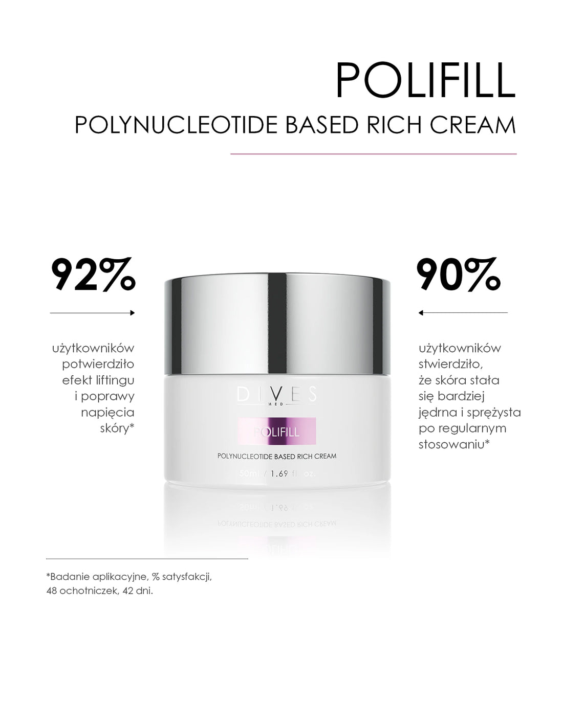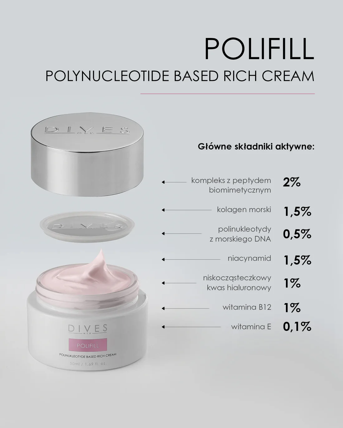 Polifill to kolekcja pielęgnacyjna stworzona z myślą o intensywnym odmładzaniu i poprawie jędrności skóry. Dzięki zaawansowanej formule opierającej się na potędze polinukleotydów, kolagenu i peptydów, Polifill oferuje kompleksową pielęgnację ukierunkowaną na wszystkie przyczyny starzenia. Linia łączy intensywne nawilżenie, regenerację oraz wygładzanie zmarszczek. Rewitalizuje skórę, zapewniając jednocześnie jędrność i elastyczność. Linia Polifill to nowa jakość pielęgnacji, która przekształca skórę, przywracając jej młodość i piękno.